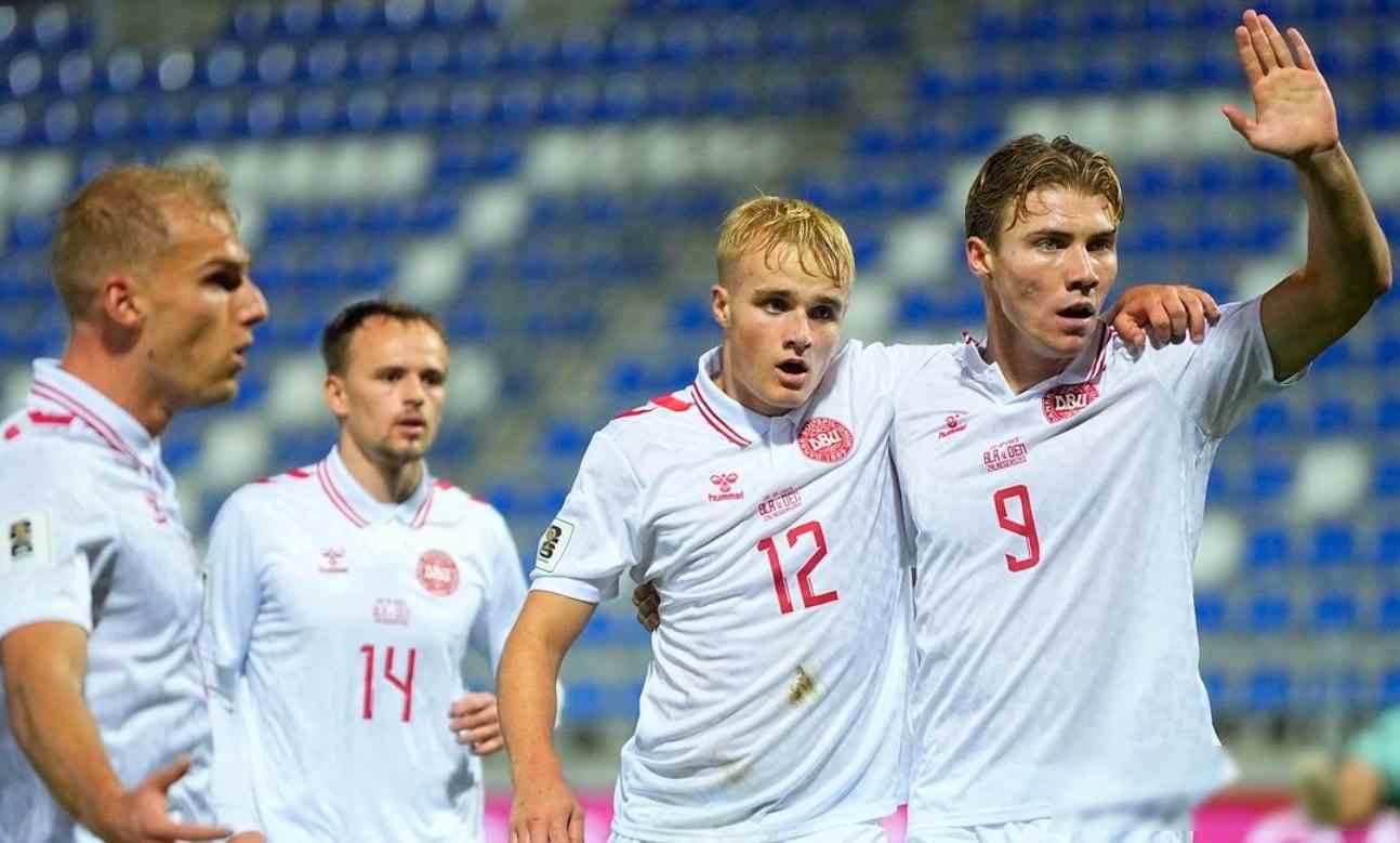上半场的对抗则更像是一次预告 比赛才进行到十四分钟 丹麦就先开花 边路传中送到弗罗霍尔特脚下 射门速度快 落点精准 前锋跟上后直接推射得手 而霍伊伦在六分钟后再度破门 甚至在中场前沿补射空门 上半场几乎已经接近帽子戏法的水平 而据说他后来还送出一次助攻 带动队友一同参与进攻 这小子看起来显得铆足了劲儿在场上拼