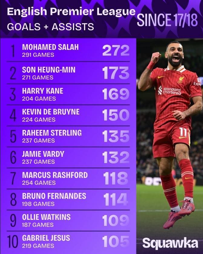 直播吧9月9日讯 2017年加盟利物浦以来,萨拉赫在进攻端展示出了极高的效率。根据Squawka的数据统计,埃及边锋共出战291场英超比赛,直接参与272球,同期断层领先。